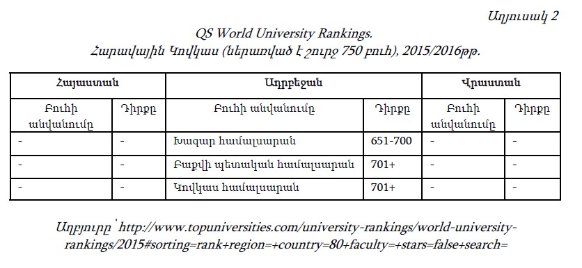 QS World University Rankings 2013թ. վարկանիշավորմամբ լավագույն բուհեր են համարվել Մասաչուսեթսի տեխնոլոգիական ինստիտուտը, Հարվարդի համալսարանը, Քեմբրիջի համալսարանը։ Հարավային Կովկասի երկրների բուհերի շարքում վարկանիշավորման այս ցուցակում ներառվել է միայն ադրբեջանական 3 բուհ, որոնք ներկայացնում ենք Աղյուսակ 1-ում։ Հայաստանի ու Վրաստանի բուհերի չընդգրկվելը թերևս պայմանավորված է կազմակերպության՝ համապատասխան տեղեկատվության բացակայությամբ։ Նկատենք, որ այլ վարկանիշային կազմակերպությունների զեկույցներում Հայաստանի և Վրաստանի մասով տվյալներ առկա են։