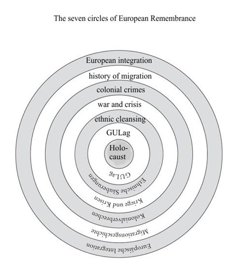 On the one hand, it is seen that this an integrative model, as it combines different experiences and perspectives. On the other hand, it is a monocentric model, because it arranges the different experiences attributed to the European remembrance tenet in a hierarchical system with the Holocaust in its center [13, p. 14].