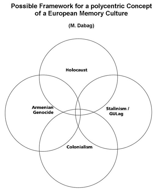 The genocide of Armenians has to be considered a core event in this seminal catastrophe, and it is important to make it clear. This has to be viewed as one of the centers of the polycentric memory discourse system, because the Armenian genocide must be perceived as the gravity center for transformation of the Asia Minor, Caucasus and Balkans, as well as implementation of the national and nation-state idea as a modern and the only possible form of communitarization in this region. It exemplifies a violent attempt of implementing a new order, i.e. establishing a homogeneous nation-state identity of people, territory and domination by complete destruction of an ethnic group which is regarded non-assimilable. Thus, the genocide committed against the Armenians has a paradigmatic position in the context of violent establishment of a nation state, because of which it forms a field of concentric circles with itself to be placed in the center of such a memory circles. This circle obviously overlaps in different dimensions with the Holocaust-centric European memory circle.