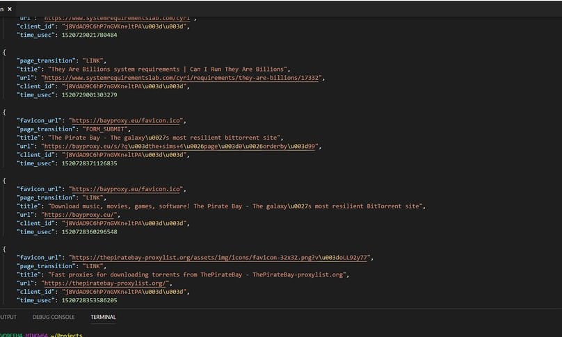 Here’s the search history document, which has 90,000 different entries, even showing the images I downloaded and the websites I accessed (I showed the Pirate Bay section to show how much damage this information can do).