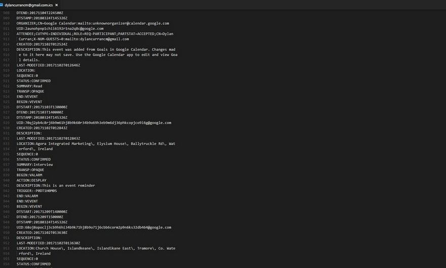 Here’s my Google Calendar broken down, showing all the events I’ve ever added, whether I actually attended them, and what time I attended them at (this part is when I went for an interview for a marketing job, and what time I arrived).