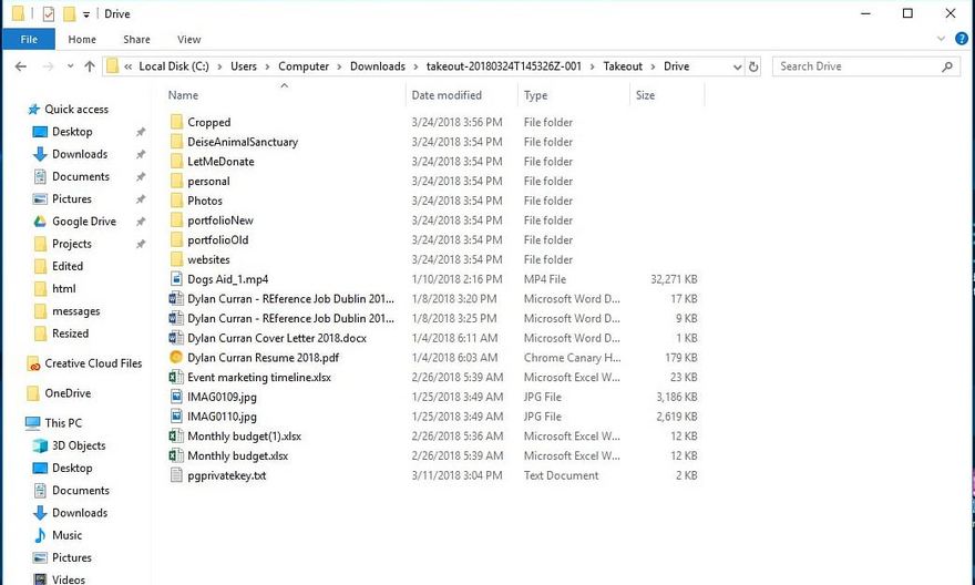 This is my Google Drive, which includes files I explicitly deleted including my résumé, my monthly budget, and all the code, files and websites I’ve ever made, and even my PGP private key, which I deleted, that I use to encrypt emails.