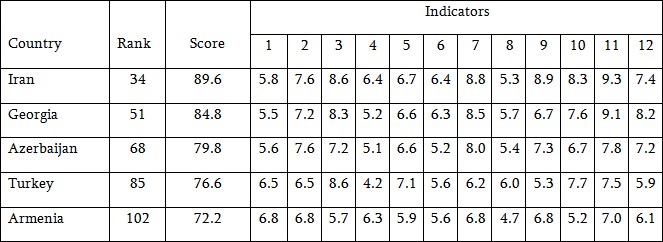 As years passed, Armenia (RoA and NKR) maintained the status of the most stable state, and this is not just a statement. As known, Foreign Policy, a reputable magazine, and Fund for Peace annually publish the Failed States Index rankings. These are prepared with a special methodology based on assessments made using an evaluation toolkit, which are expressed in values of 12 indicators (see Table 1). According to this methodology, the lower the score for a country, the more stable/accomplished it is, i.e. the lowest ranking country is the most accomplished one. Results of the 2012 Failed States Index are shown in the Table 2 below1 (the numbered columns correspond to the indicators of Table 1). As seen, Armenia has considerably lower scores than its neighbors and is a regional leader with a wide margin, i.e. Armenia is the most accomplished state in the region, which has been traditionally the case for a number of years in this reputable international ranking system.